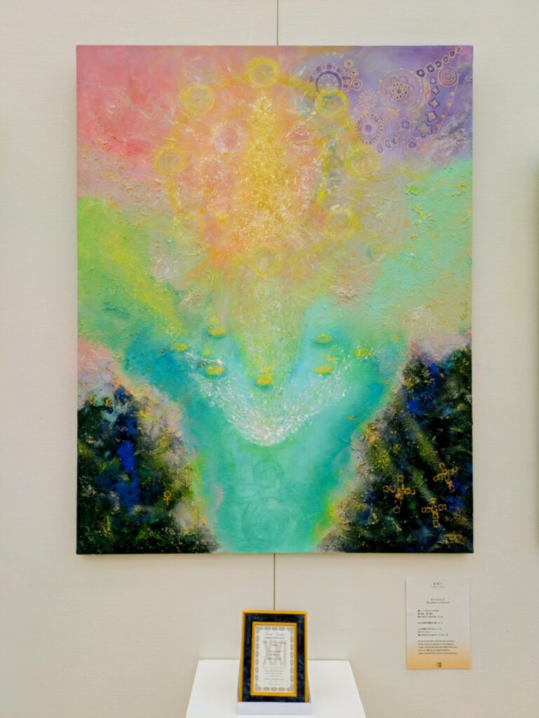 コンテラリーアート部門で入選出展させていただいております。お近くにお寄り際にはぜひご覧いただけたら幸いです。この絵の題は『祈りのチカラ』です。祈りは地球の裏側まで届くという。きっと、小さな祈りも、宇宙の果てまで届いているのだろう。愛する者のために多くを祈って祈り足りないことはないと信じます。そして、誰も一人では生きていかれないこと、弱い時も強い時も、誰かが大切な誰かのために幸せを祈り続けていることを知っていてほしい。というコンセプトをもとに、時に胸に切なさを感じつつ、それでも誰かの心に届いたらいいなあと温かい愛情を満タンにして、描き上げました。多くの方の目に触れてもらえたら幸せです。1167×910cmミクストメディア