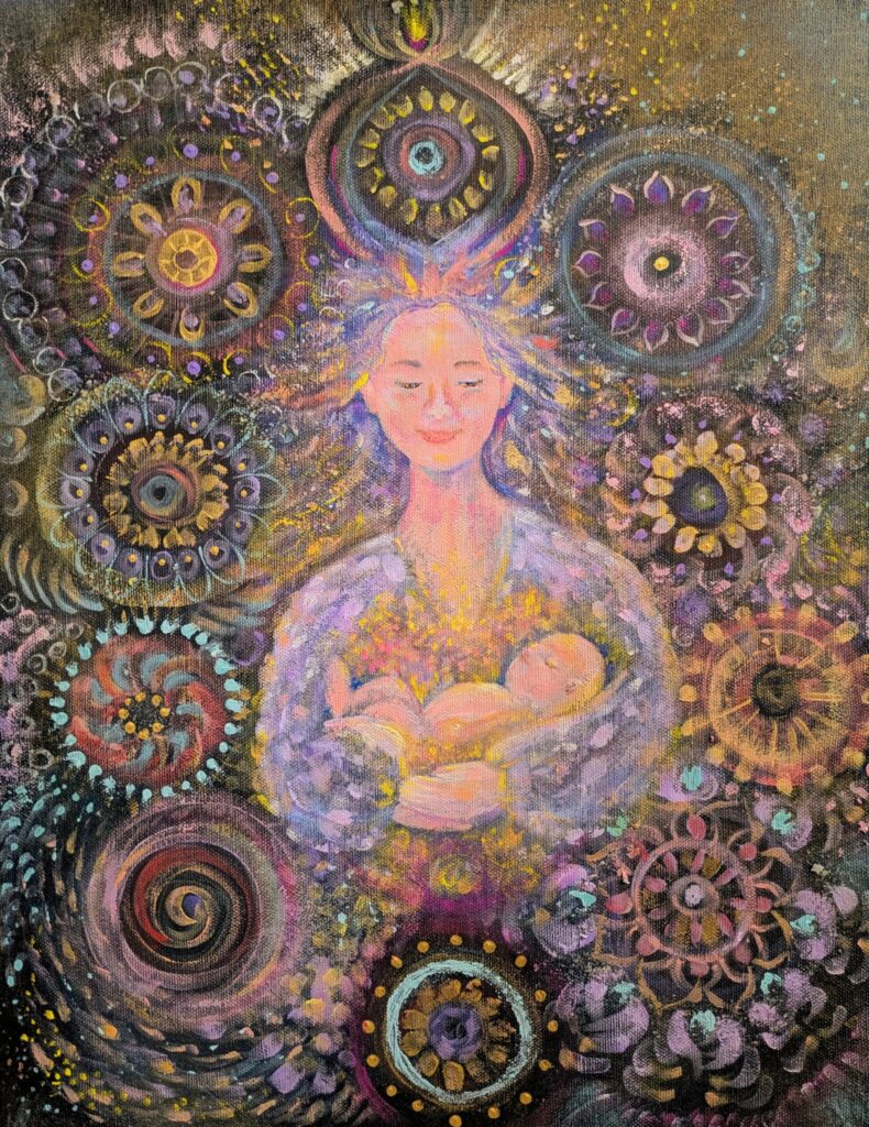 女性を取り囲むように描かれたいくつもの曼荼羅は、まさに**「宇宙からの贈り物」**である光の結晶。一つひとつの円が独立しながらも調和し、宇宙の真理や魂の輝きを表現しています。Junonnaにつながる一人ひとりの個性あるみなさまも表現しています。